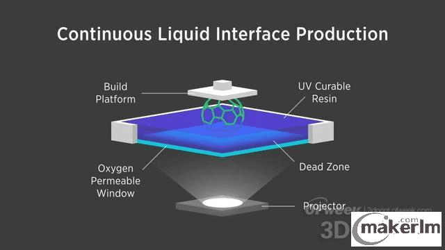 現(xiàn)有的3D打印工藝使用液態(tài)樹脂,在一個(gè)緩慢的過程中逐層打制作出物品:先打印一層,固化它,補(bǔ)充樹脂材料,然后再打印一層,周而復(fù)始,直到打印完成。而在CLIP工藝中,一個(gè)投影機(jī)從下方用紫外線顯示連續(xù)的、極薄的物品橫截面。紫外線在一缸液態(tài)樹脂中以橫截面方式硬化液體。與此同時(shí),一臺升降機(jī)不斷將成形的物體撈出樹脂缸。